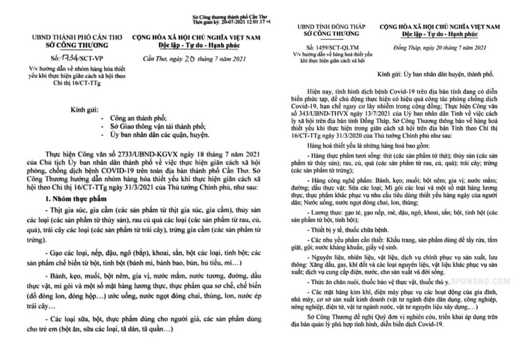 Ngày 20/7/2021, nhiều tỉnh khu vực miền Nam ra công văn mô tả về hàng hóa thiết yếu. Đáng chú ý, TP. Cần Thơ đã có văn bản nêu rõ bánh mì là thực phẩm. Ngoài ra còn có thức ăn chăn nuôi, thuốc bảo vệ thực vật, thuốc thú y thủy sản… Cụ thể, […]