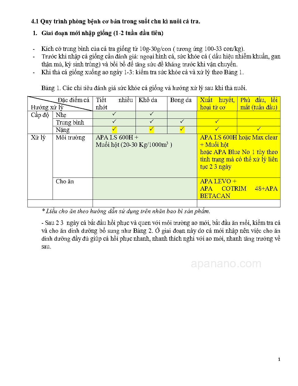 1. QUY TRÌNH PHÒNG BỆNH CƠ BẢN TRONG SUỐT CHU KÌ NUÔI CÁ TRA